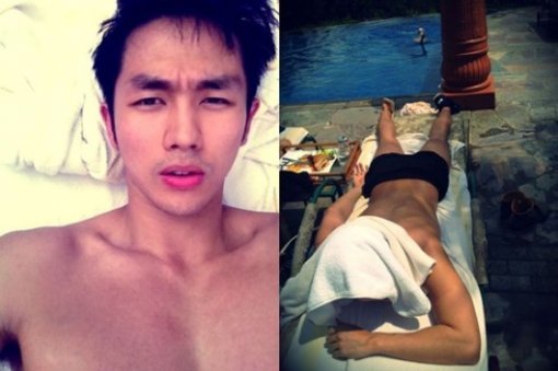 사진 속 임슬옹은 호텔 수영장에서 수영복을 입고 엎드려 태닝을 즐기고 있다. 그는 넓은 어깨와 탄탄한 등근육 등 상반신을 노출해 눈길을 끌고 있다.