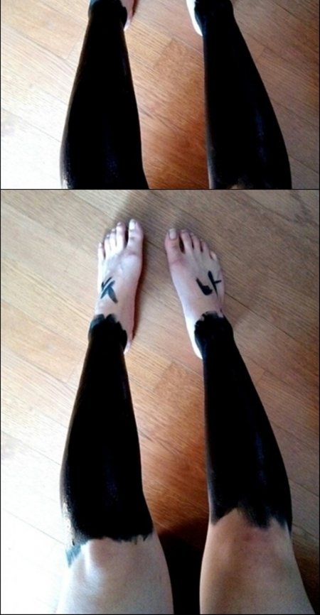 공개 된 사진에는 한 여성이 검정 레깅스를 입고 찍은 모습이 담겼다. 그러나 다음 사진을 보면 다리가 검정색 물감으로 칠해져 있다는 것을 알 수 있다.