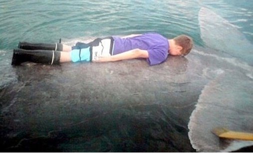 사진 속에는 한 소년이 고래 등에 엎드린 채 누워 있는 모습이 담겼다. 고래 등 위임에도 불구하고 소년은 편안하게 누워 있어 눈길을 끌었다.