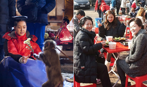 MBC ‘마의’ 이요원(위)이 난로를 쬐며 추위를 달래고 있다. SBS ‘내사랑 나비부인’의 김영애는 추위에 고생하는 동료들을 위해 점심을 준비했다. 사진제공|김종학프로덕션·판타지오