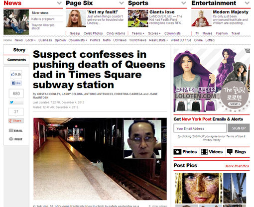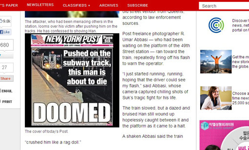 뉴욕의 타블로이드신문 ‘뉴욕포스트’(NYP)가 3일(현지시각) 지하철역에서 떠밀려 전동차에 치여 숨진 50대 한국인 남성의 사고 사진을 커버면에 실어 논란의 대상이 되고 있다.