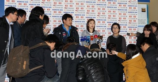 피겨여왕 김연아가 5일 오후 인천국제공항 출국장 앞에서 취재진의 질문에 답변을 하고 있다.
