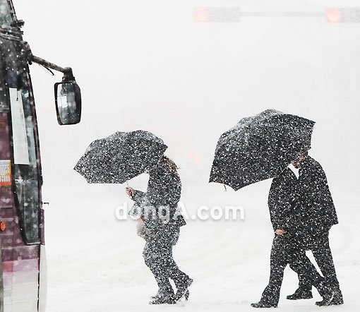 서울, 경기에 대설주의보가 내려진 가운데 5일 오후 인천국제공항에서 시민들이 눈을 뚫고 발길을 서두르고 있다.