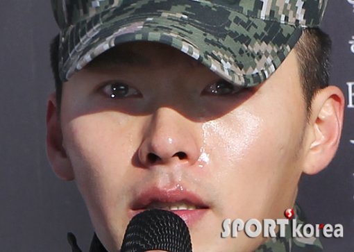 배우 현빈이 6일 오전 경기도 화성시 해병대 사령부에서 만기전역을 명받아 전역신고를 하던 중 감정에 북받혀 눈물을 흘리고 있다.