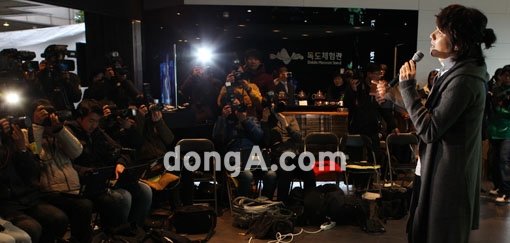 가수 김장훈이 7일 오후 서울 서대문구 임광빌딩 독도체험관에서 10집 정규앨범 ‘Adieu(아듀)’ 발매 기자회견에서 노래를 부르고 있다.