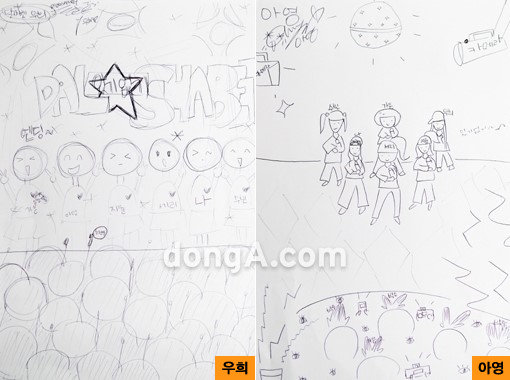 #아영(우)- “무대가 시작되고 관객과 카메라를 모두 표현했어요. 관객은 박수를 치고 폭죽과 미러볼이 준비돼 있는 것을 그렸어요.”