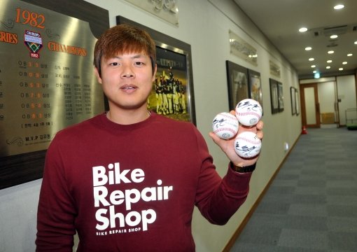 두산 윤석민이 폭설이 내린 궂은 날씨에도 불구하고 잠실구장에 나와 스포츠동아 트위터 인터뷰에 응했다. 윤석민이 팬들에게 선물할 친필 사인볼을 들고 환하게 웃고 있다. 사진제공|두산 베어스