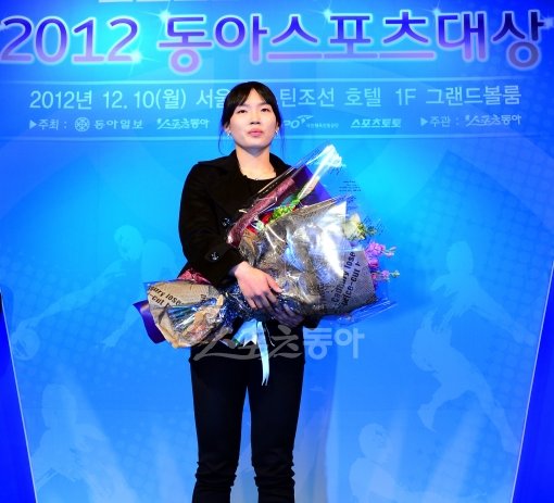 10일 오전 서울 웨스틴조선 호텔 그랜드볼룸에서 열린 2012 동아스포츠 대상 시상식에서 도로공사 김해란이 여자 프로배구 올해의 선수상을 수상하고 있다.