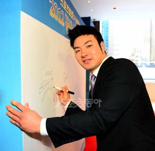 시상식에 참석한 프로야구 넥센 박병호가 사인보드에 사인을 하고 있다.