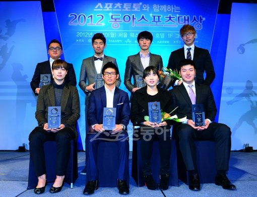 10일 오전 서울 웨스틴조선 호텔 그랜드볼룸에서 열린 2012 동아스포츠 대상 시상식에서 올해의 선수에 선정된 수상자들이 포토타임을 갖고 있다. (김대섭 프로골프, 하대성 프로축구, 곽승석 프로배구, 오세근 남자 프로농구, 박병호 프로야구, 김해란 여자프로배구, 양학선 특별상, 신정자 여자프로배구(이경은 대리수상) 이상 뒷줄부터 시계방향) 박화용 기자 inphoto@donga.com 트위터 @seven7sola