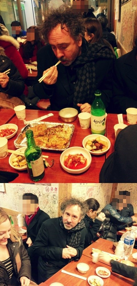 사진 속 팀 버튼 감독은 코트와 세련된 머플러를 입고 광장시장의 한 식당에서 빈대떡과 막걸리를 먹느라 열중하는 모습이다. 그에겐 다소 생소한 음식인지라 그의 표정도 신기한 듯한 표정이다.