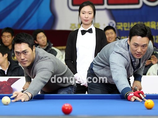 롯데자이언츠 조성환(왼쪽)과 삼성라이온즈 이승엽이 12일 오전 서울 송파구 배명중고등학교 체육관에서 열린 ‘2012 프로야구선수 3쿠션대회’에서 대결을 펼치고 있다.