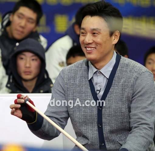 삼성라이온즈 이승엽이 12일 오전 서울 송파구 배명중고등학교 체육관에서 열린 ‘2012 프로야구선수 3쿠션대회’에서 큐에 초크칠을 하고 있다.