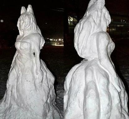 사진에는 드레스를 입은 눈사람이 담겨 있다. 보통의 눈사람과는 다르게 여성의 모습이 자세하고도 정성스럽다.