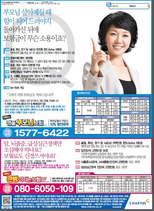 차티스 ‘명품부모님보험’은 50세에서 75세까지 가입이 가능하고 최대 89세까지 연장할 수 있다. 부부가 동시 가입하면 10%의 할인 혜택이 있어 직접 가입하기에도 적당하고, 부모님을 위한 실속 효도상품으로도 부담이 적다. 또 당뇨나 고혈압이 있어도 상담 후에 가입 가능해 보험 가입을 망설였던 소비자들이 눈 여겨 볼 만하다.