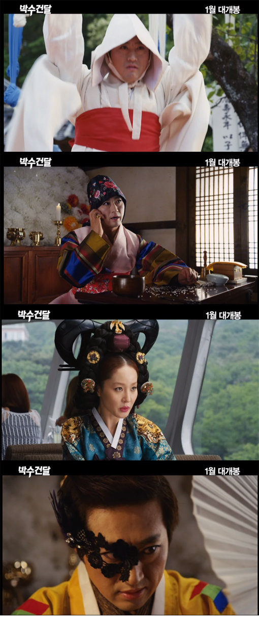 잘 나가던 엘리트 건달에서 하루아침에 박수무당이 되어버린 한 남자의 아찔한 이중생활을 그린 영화 ‘박수건달’이 메인 예고편을 공개했다.