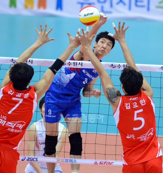 개막전을 앞두고 발목 인대 부상을 당했던 대한항공 ‘살림꾼’ 곽승석(왼쪽)이 11일 KEPCO전을 통해 코트로 복귀했다. 8월 수원컵 대회에서 스파이크 하고 있는 모습. 스포츠동아DB