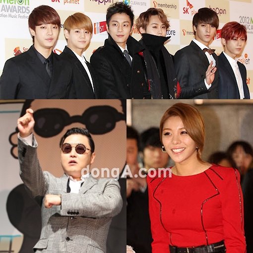 비스트와 싸이는 14일 오후 서울 송파구 방이동 올림픽 공원 체조경기장에서 열린 '2012 멜론 뮤직 어워드'(MelOn Music Awards 2012, 이하 MMA)에서 각각 3관왕에 오르며 시상식 최다 수상의 영예를 안았다.