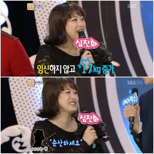 심진화는 “요즘 살이 많이 올랐다”는 MC 이휘재의 말에 “우리나라에서 최초로 임신을 하지 않고 결혼 후 17㎏이 쪘다”며 “한 아저씨 팬이 ‘순산하세요’라고 말했다”고 전했다.