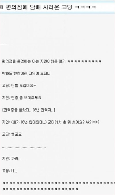 딱 봐도 고등학생으로 보이는 손님이 2008년도 전역증을 내밀자 황당했던 아르바이트생은“군대에서 총 뭐 썼어요? AK? M4”라고 손님을 떠봤다.