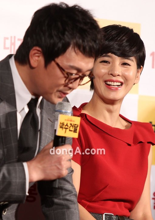 배우 정혜영이 17일 오후 서울 동대문구 메가박스에서 열린 영화 ‘박수건달’ 제작보고회에서 김정태를 바로보고 있다.