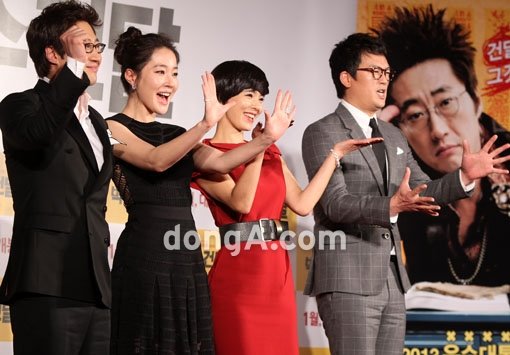 배우 박신양, 엄지원, 정혜영, 김정태(왼쪽부터)가 17일 오후 서울 동대문구 메가박스에서 열린 영화 ‘박수건달’ 제작보고회에서 포즈를 취하고 있다.