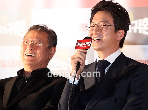 배우 정준호(오른쪽)와 박근형이 17일 오후 서울 광진구 롯데시네마 건대입구에서 열린 영화 ‘가문의 영광 5-가문의 귀환’ 제작보고회에서 취재진의 질문에 답변을 하고 있다.