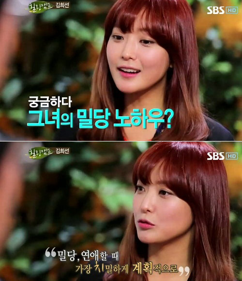 김희선은 "연애할 때가 가장 치밀하게 필요하다. 예를 들어 3번에 한번은 약속 있다고 튕긴다. 그래놓고 집에서 TV를 본다. 일부러 사람 많은 나이트클럽을 가서 그 사람 귀에 들어가게 한다. 긴장감과 질투심을 유발하는 방법이다. 그게 하나의 밀당이라고 생각한다"고 밝혔다.