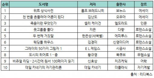 리디북스에서는 '사랑은 상처를 허락하는 것이다(책읽는동네, 공지영)'가 신간으로 등장했다. 이 책은 작가 공지영이 25년 간의 작가 인생을 돌아보며 20여 편의 작품에서 중요한 글귀들을 모은 앤솔로지(Anthology, 선집, 몇 가지의 작품을 추려 편집한 책)이다. 이를 통해 인생의 의미와 깨달음, 사랑에 대한 고찰 등을 느낄 수 있다.