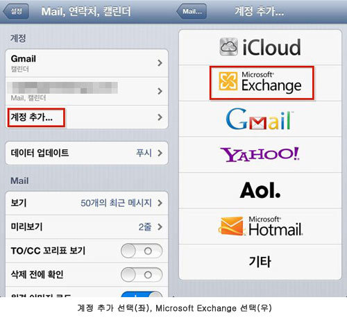스크린샷처럼 ‘계정 추가…’를 선택하고, ‘Microsoft Exchange’를 누른다.