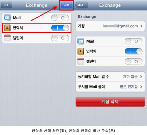 그 다음 메뉴의 Mail, 연락처, 캘린더에서 연락처를 활성화하고 저장을 누르면 모든 설정이 끝이다.
