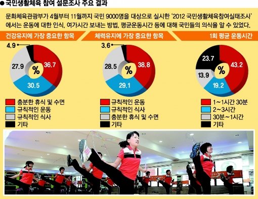 문화체육관광부(장관 최광식)가 실시한 ‘2012 국민생활체육참여실태조사’ 결과 우리나라 국민 중 규칙적인 운동을 하고 있는 비율은 35.9%에 불과하다. 국민생활체육회가 국민을 대상으로 캠페인을 하고 있는 ‘7330’(일주일에 세 번, 30분 이상 운동하기)에 미치지 못하는 ‘1회 30분 이상, 주 2회 이상 운동’을 하는 비율도 조사 대상의 34.9%에 그쳤다.