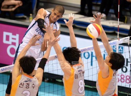 삼성화재 레오(뒤)가 18일 대전 충무체육관에서 벌어진 KEPCO와 경기에서 상대 블로커 3명을 앞에 두고 강력한 스파이크를 때리고 있다. 대전|김종원 기자 won@donga.com 트위터@beanjjun