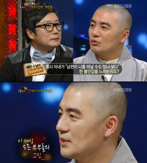 이에 혜민스님은 잠시 고민스러운 표정을 짓더니 “혹시 아내에게 ‘나를 떠날 수도 있다’라는 불안감을 준 적이 있느냐”고 물은 뒤 “아내와 남편사이에 있는 불안요소를 찾아내라. 사랑하는 부부사이이므로 상대가 기뻐하는 것을 그대로 바라보라”고 조언해 눈길을 끌었다.