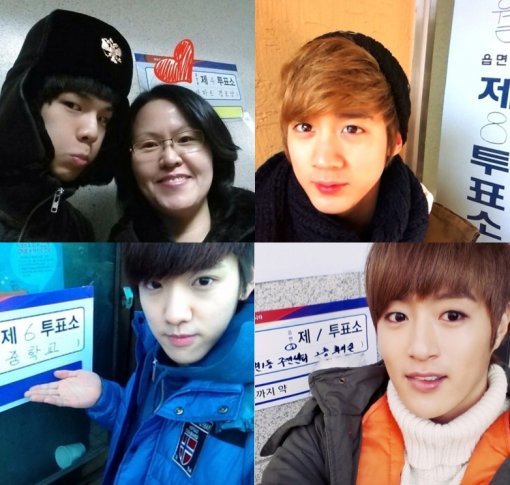 틴탑과 백퍼센트는 19일 각자 자신의 트위터에 투표 인증샷을 게재했다. 캡은 “추운 아침부터 어머니와 투표 ~♥ 모두 투표 화이팅!” 이라는 글과 함께 한 장의 사진을 올렸다.