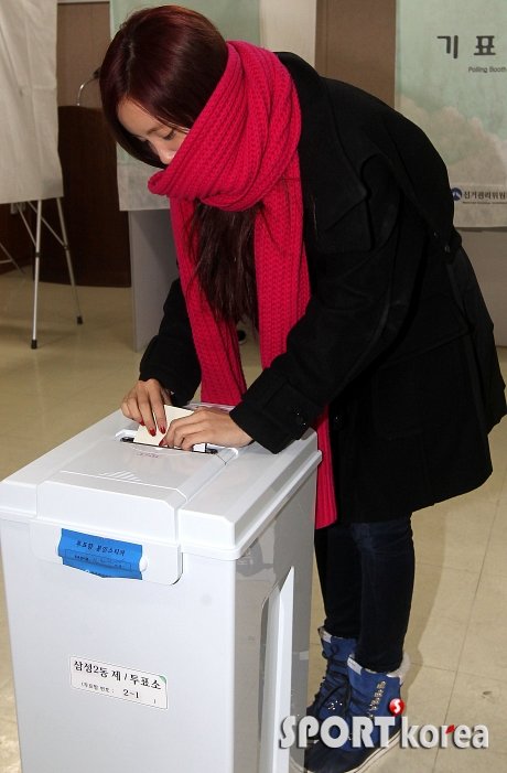 걸그룹 티아라의 효민이 19일 오전 서울 삼성2동 제1투표소에서 열린 ‘제18대 대통령선거’에서 투표로 소중한 한표 행사하고 있다.