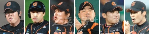 (왼쪽에서부터)김성배-손아섭-이명우-송승준-최대성-이용훈. 스포츠동아DB