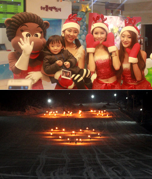연말연시 빅 시즌에 스키팬을 유혹하는 스키장의 다양한 이벤트. 웅진플레이도시의 크리스마스파티(위 사진)와 지산리조트의 횃불스키 퍼포먼스. 사진제공|웅진플레이도시·지산리조트