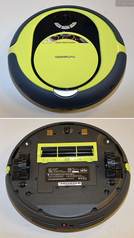 제품은 납작하고 둥근 모양. 전체적인 디자인은 기존 로봇청소기와 유사하다. 개인적으로 형광빛이 감도는 라임색의 제품 색상이 마음에 들었다. 대개 로봇청소기 색상이 검정, 흰색, 빨강색인 것과 비교해 산뜻한 느낌을 받았다. 제품 상단에는 조작 버튼 및 작동 표시등이 있고, 앞면에는 장애물을 감지하는 센서가 달렸다.