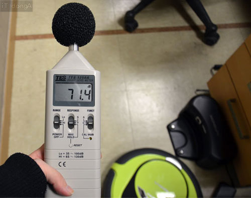 본격적으로 로봇청소기를 사용해봤다. 본체의 버튼을 누르거나 리모컨을 이용하면 로봇청소기를 작동할 수 있다. 로봇청소기가 청소를 시작하자 들리는 소리에 깜짝 놀랐다. 소음측정기로 직접 측정해 본 수치는 약 70~72dB(가까운 위치에서 잰 수치다). 참고로 조용한 사무실의 소음이 50dB, 일상 대화가 60dB, 지하철 소음이 80dB 정도다. 실제로 청소기가 동작하는 동안 대화 또는 전화하거나, 음악 감상, TV 시청 등에 불편을 겪었다. 흡입력을 조절하면 소음을 조금 줄일 수 있지만, 그래도 약간 시끄러웠다. 예약 청소 기능을 이용하면 매일 아침 알람으로 사용할 수 있겠다는 생각도 불현듯 들었다. 요새 출시되는 로봇청소기 대부분이 조용한 것과 비교했을 때, 이 소음은 치명적인 약점이 아닌가 싶다.