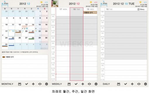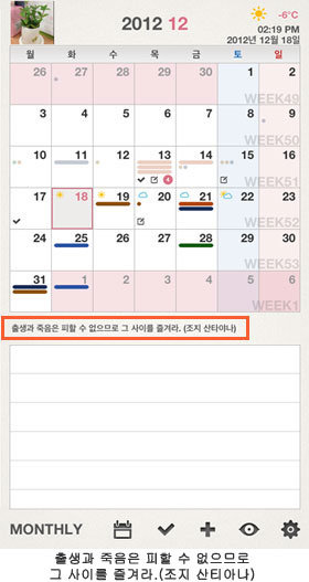 필요한 정보를 빠르게 알 수 있는 화면 구성도 눈에 띈다. 일정을 입력하다 날씨가 궁금하면 화면을 오른쪽으로 끌어 주간 날씨 정보를 확인했다. 일정과 할 일을 입력하는 버튼을 따로 만들어 놓은 점도 좋았다. 입력 시 일정인지 할 일인지 선택하는 '한 단계'가 줄어든다.