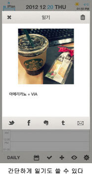 구글 연동 플래너지만 일기도 쓸 수 있다. 사진은 한 장만 첨부할 수 있고 폰트도 바꿀 수 없어 간단한 기록 시에만 사용했다. 일기를 보다 본격적으로 쓰고 싶다면 다른 일기 전용 앱을 권한다.