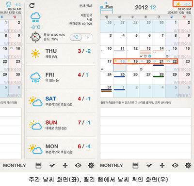 야외 활동 일정을 짤 때 이 앱을 활용하면 날씨 정보를 바로 확인할 수 있다. 알림창의 날씨 정보를 확인하거나 별도 날씨 앱을 실행할 필요가 없다. 현재 위치 주변의 날씨도 알려주며, 특정 지역을 검색할 수도 있다. 또한, 월간 탭에 아이콘 형태로 이번 주 날씨를 표시해준다. 정확도는 야후 날씨 예보(아이폰 기본 알림 날씨 앱)보다 믿음직스럽고, 기상청 날씨 예보보다는 떨어지니 참고만 하는 것이 좋겠다.