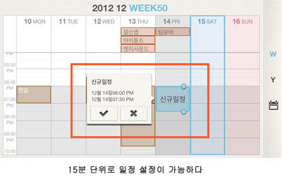 손으로 가볍게 눌러 원하는 시간 대에 15분 단위로 일정을 만들 수 있다. 늘리거나 줄여 일정 소요 시간을 설정하는 것도 소소한 재미다.
