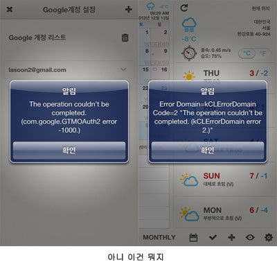 출시한지 얼마 되지 않아(1.2 버전 기준) 앱 실행 시 자잘한 오류가 자주 발생한다. 특히 구글 캘린더 계정을 수정하거나 캘린더 이동 등을 할 때 오류가 잦았다. 오류 알림창은 마치 컴퓨터의 '블루 스크린'이 뜬 것 마냥 무슨 내용인지 이해할 수도 없다. 그럴 때 마다 앱을 껐다 켜야 하니 귀찮다.