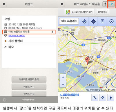 일정 입력 시 '장소'를 설정하면 아이폰 지도 또는 구글 지도를 활용할 수 있다. 하지만 아이폰 기본 지도는 형편없다. 구글 지도도 '다음 맵', '네이버 지도' 등 국내 지도 앱보다 한참 떨어지는 수준이므로, 주력으로 쓸 수는 없고 참고할 때나 쓸만하다(도로 등은 그나마 제대로 표시되지만 건물 정보는 부실하다).