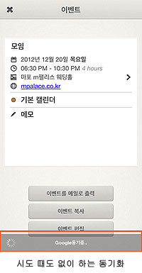 이 앱은 무척 '부지런'하다. 앱을 실행하든, 일정을 만들든, 편집하든 언제나 동기화를 한다. 이상한 점이 하나 있다. 캘린더 하나에 엮인 일정 하나만 수정해도 그 계정에 속한 '모든' 캘린더를 다 동기화한다. 동기화하는 도중 다른 일정을 입력하면 오류도 가끔 발생한다. 동기화 중에는 다른 편집을 하지 못하고 기다려야 한다. 이렇게 자주 동기화하기 보다는 '동기화 버튼'을 따로 만들어 사용자가 원할 때 동기화할 수 있게 하는 편이 좋겠다.