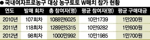 국내여자프로농구를 대상으로 한 농구토토 W매치가 2010년부터 올해까지 3년 연속 연간 참가자 수 100만명을 돌파했다.
