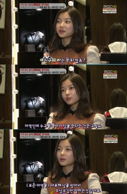 이날 진행된 인터뷰에서 김유정이 출연했던 작품과 관련된 이야기를 나누던 중 “‘2012 연기대상’ 아역상이 누가 될 것 같은가”라는 제작진의 질문에 김유정은 “당연한 거는 진구 오빠는 꼭 따야겠죠?”라며 함께 호흡을 맞췄던 아역 배우 여진구를 언급했다.