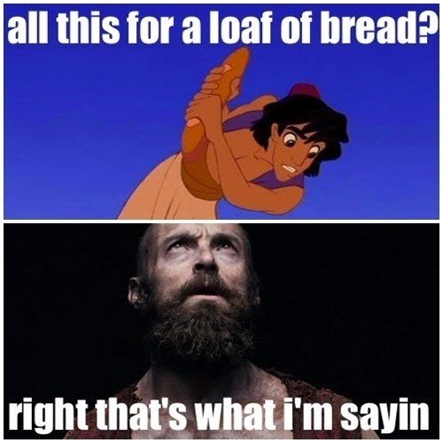 공개된 사진에는 애니메이션 ‘알라딘’의 한 장면과 “고작 이 빵 한 덩어리 때문에 이 모든 일이 일어난 거야?”라는 글이 있고 아래 사진에는 영화 ‘레미제라블’의 주인공인 휴잭맨의 모습과 “내 말이 그 말이야”라는 말과 함께 알라딘을 애절하게 바라보는 장면이 담겨있다.